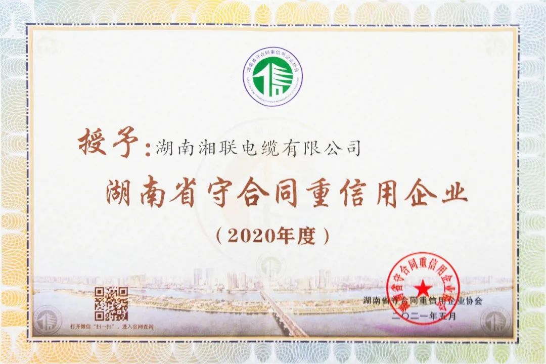喜訊|湘聯電纜榮獲“2021年度湖南省守合同重信用企業”